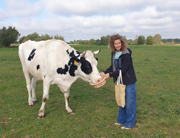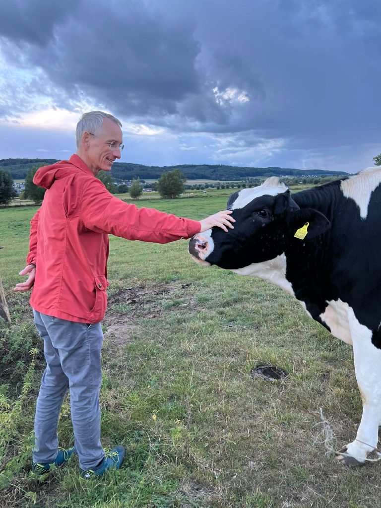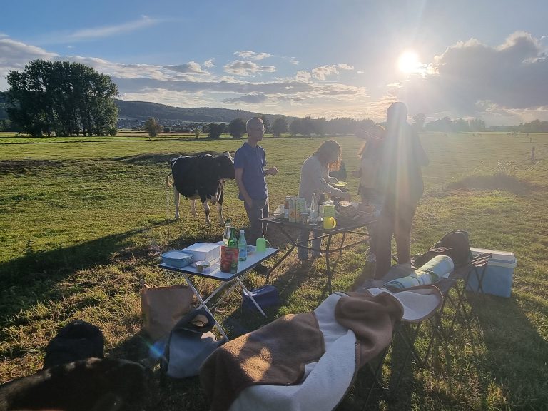 Spätsommerliches Picknick- wir gingen rein in die Herde und die neugierigen Kühe erkundeten uns und natürlich unseren Tascheninhalt. Nach einem Karottenimbiss freuten sich die friedlichen Riesen über unsere Streicheleinheiten.