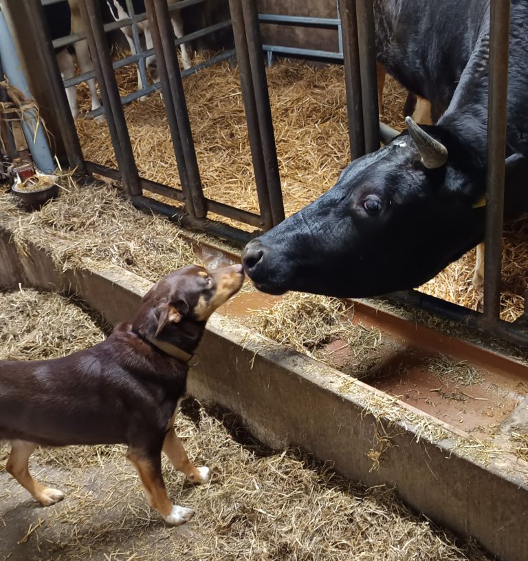Ein rührender Moment: AMY die Hofhündin begrüßt RUBY mit Küsschen.